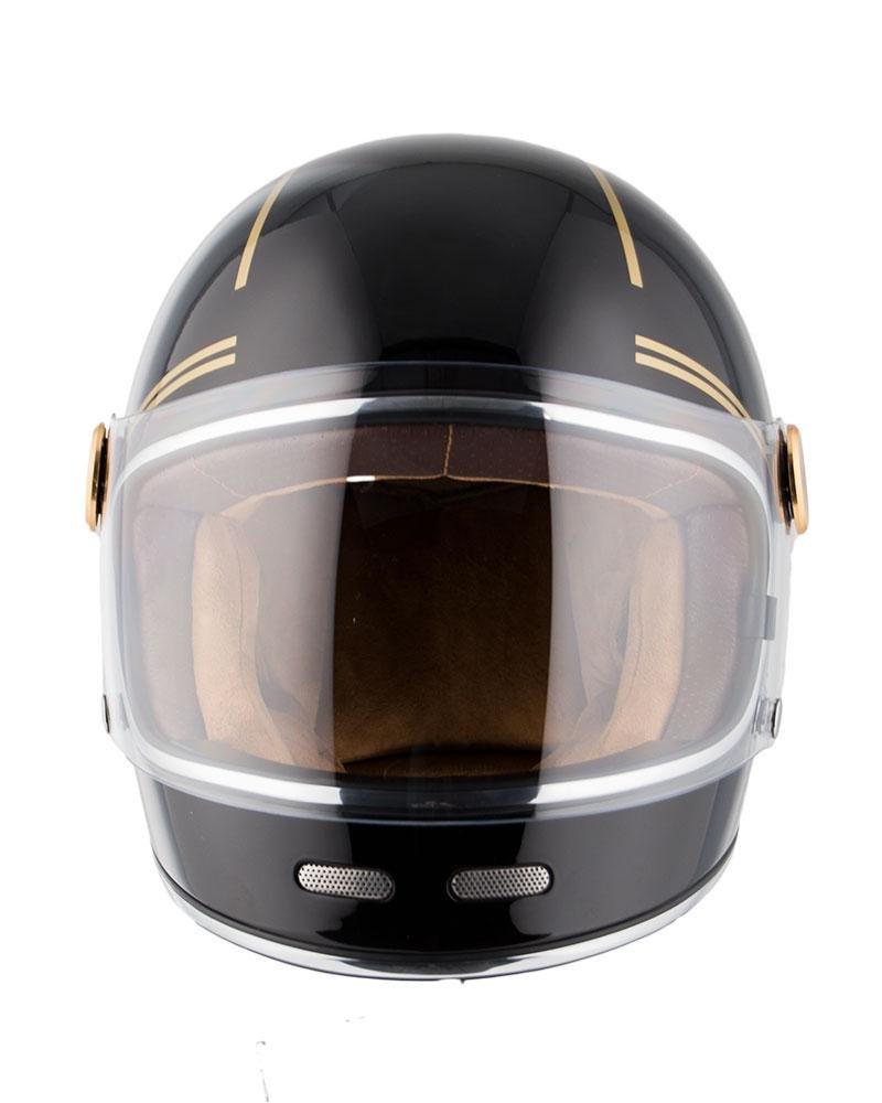 El casco retro Roadster III Gold Black no es solo un casco, es una declaración de estilo. Su diseño atemporal y su acabado dorado lo convierten en el complemento perfecto para cualquier motocicleta clásica o custom. La combinación de líneas curvas y detalles cromados crea un aspecto elegante y sofisticado que te hará sentir como un verdadero motorista.