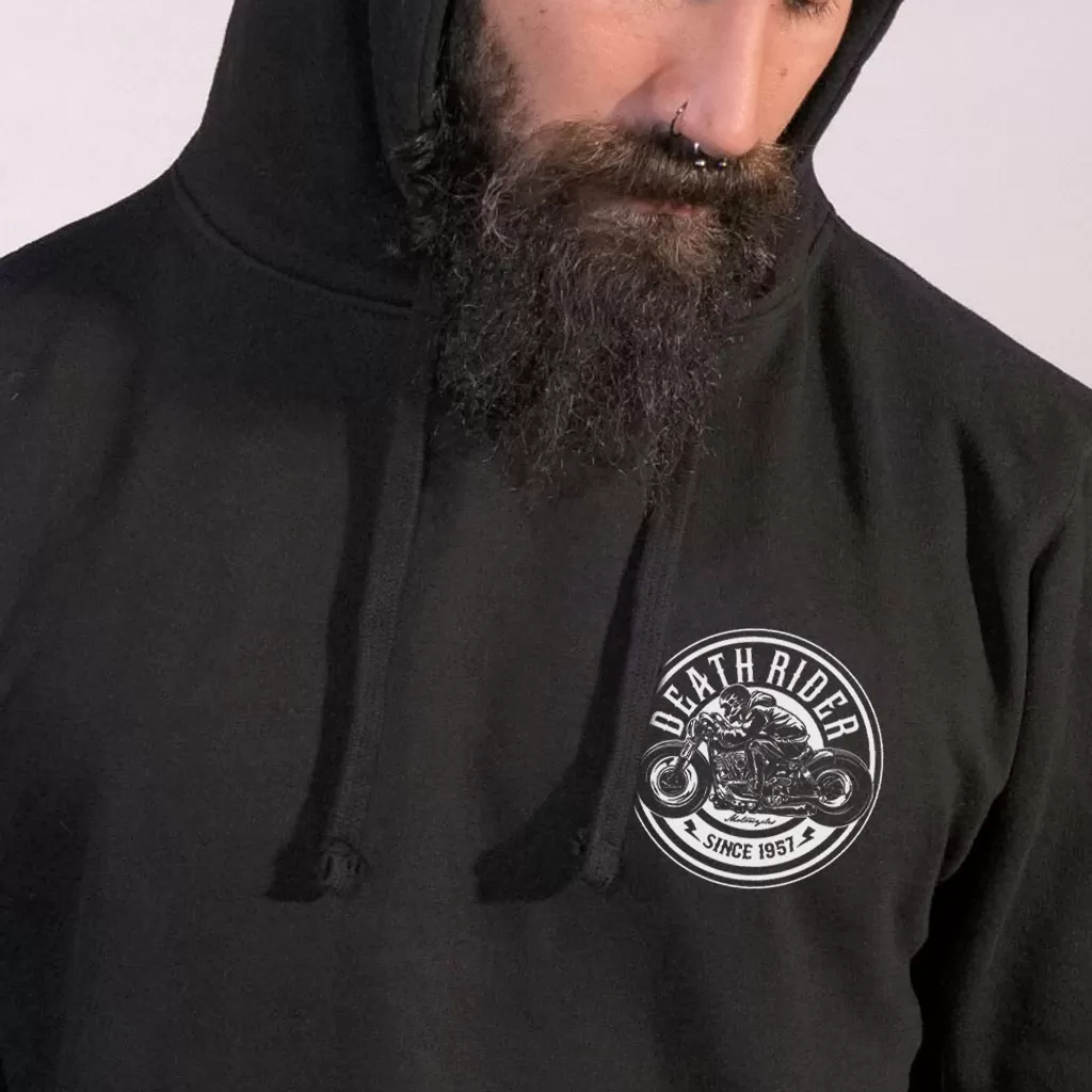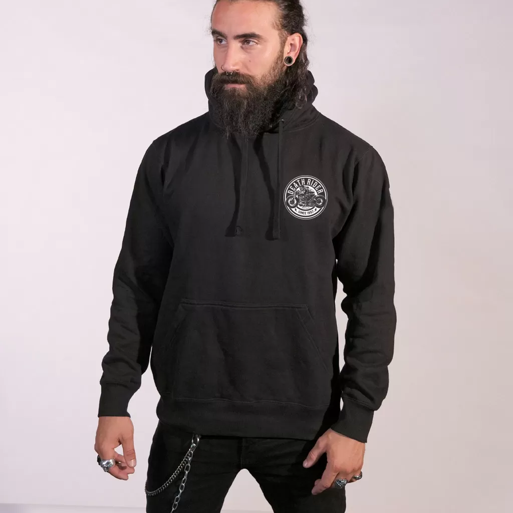 La Sudadera con capucha Death Rider «Motorcycle» tiene una ilustración única, realizada especialmente para nuestra marca. La imagen muestra a un rider en su moto. Así podrás llevar tu pasión siempre contigo, también impresa en tu ropa. El logotipo principal está en la espalda de la sudadera, mientras que en la parte delantera (parte superior del pecho izquierdo) aparece una versión más pequeña. Esta prenda es sencilla, pero con carácter. Puedes combinarla con cualquier tipo de atuendo, ya sea en un contexto informal o en un viaje en moto.